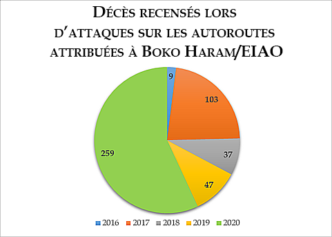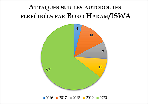 Les attaques sur les autoroutes représentent maintenant 13 % des évènements violents liés à Boko Haram et l’EIAO dans l’État de Borno. Les vols, les enlèvements, les incendies de véhicules et les exécutions sommaires figurent parmi les crimes commis durant ces attaques. En 2020, on rapporte que 90 % des enlèvements attribués aux militants ont eu lieu lors de telles embuscades routières. Ces vols sont aussi une source importante de revenus et de matériel militaire pour les militants.