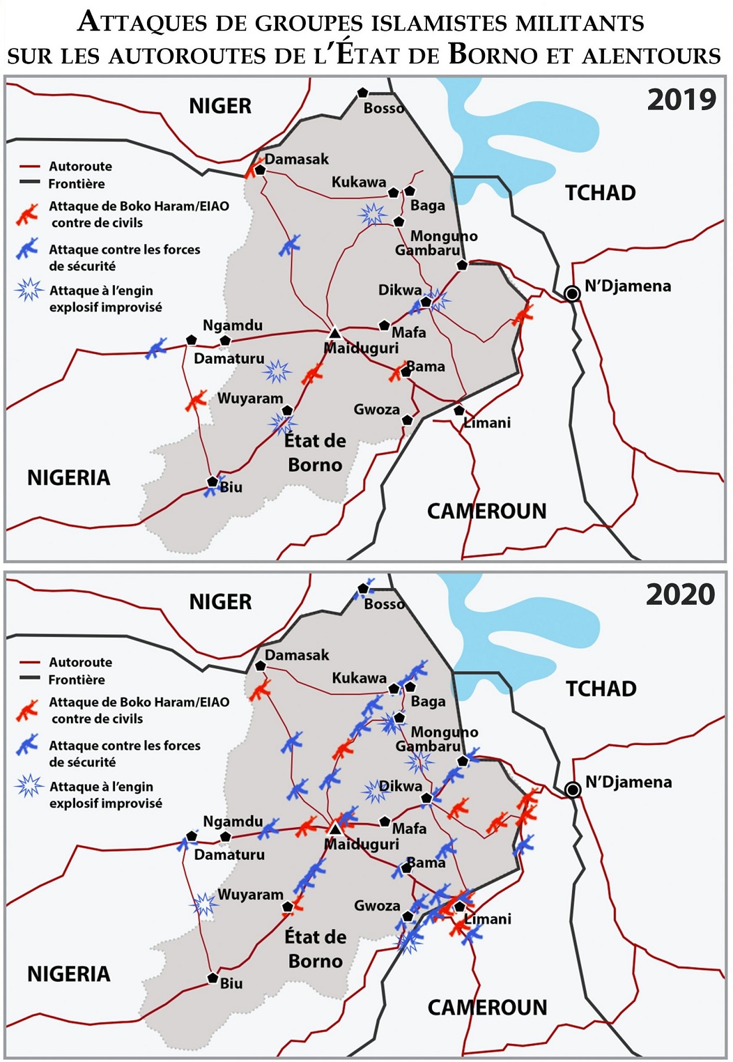 Les attaques sur les autoroutes représentent maintenant 13 % des évènements violents liés à Boko Haram et l’EIAO dans l’État de Borno. Les vols, les enlèvements, les incendies de véhicules et les exécutions sommaires figurent parmi les crimes commis durant ces attaques. En 2020, on rapporte que 90 % des enlèvements attribués aux militants ont eu lieu lors de telles embuscades routières. Ces vols sont aussi une source importante de revenus et de matériel militaire pour les militants.