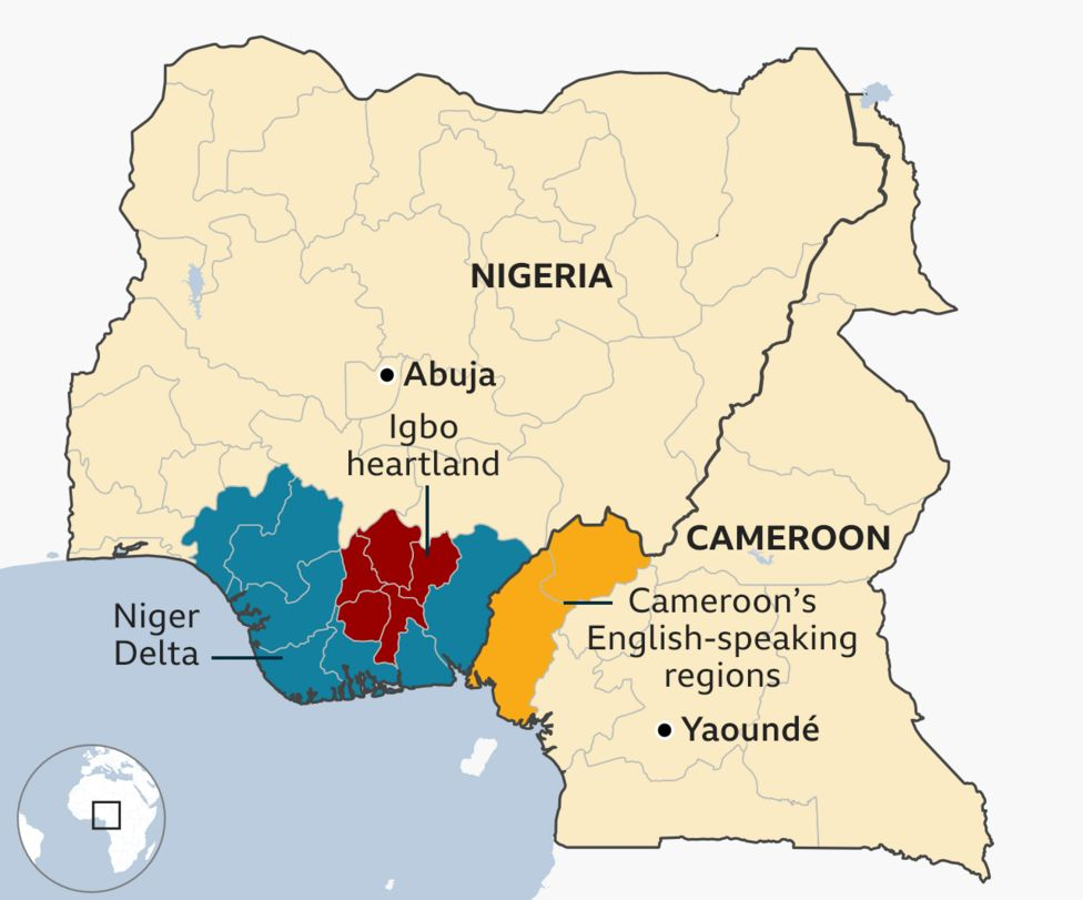 It is partly made up of the Niger Delta, a huge forested area full of creeks and inlets and multiple clandestine ports, which borders both English-speaking Cameroon and the Igbo heartland, where most Ipob attacks are concentrated.