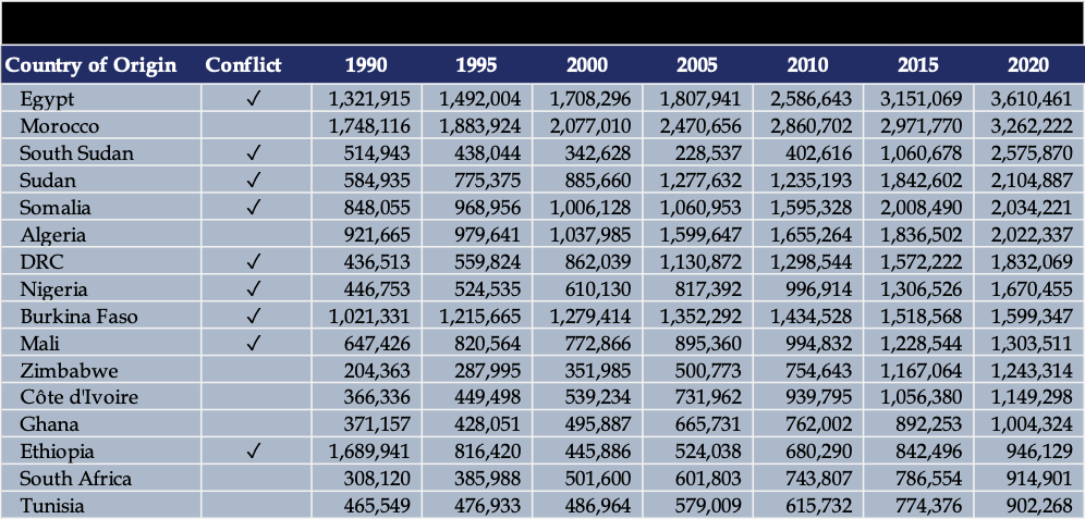 North Africans make up the majority of African immigrants to Europe. The top three—Morocco, Algeria, and Tunisia—comprise over 5 million of the 11 million African migrants in Europe. This underscores the importance of proximity, established diasporas, and economic opportunity as key “pull” factors influencing migration decision making.